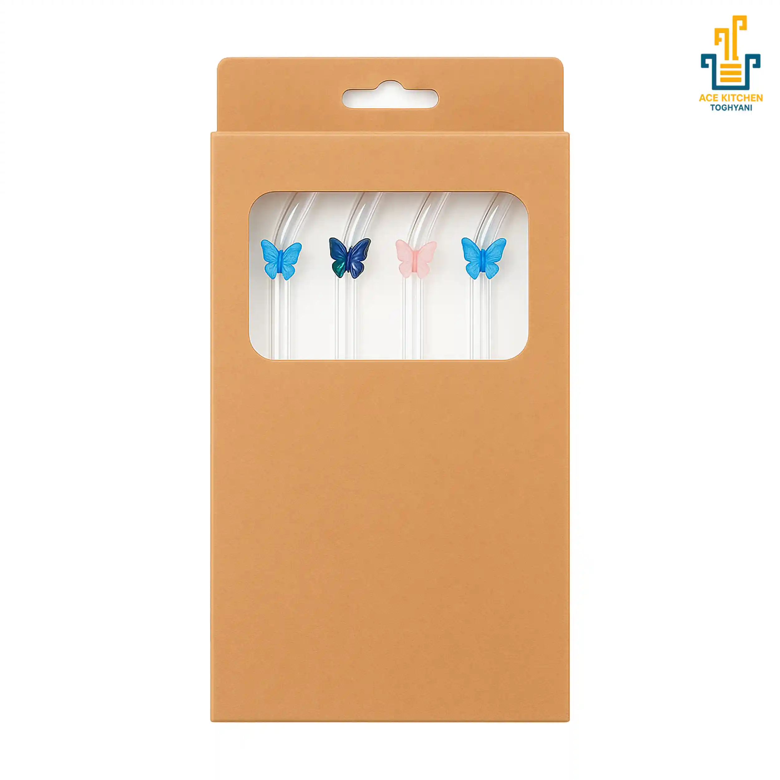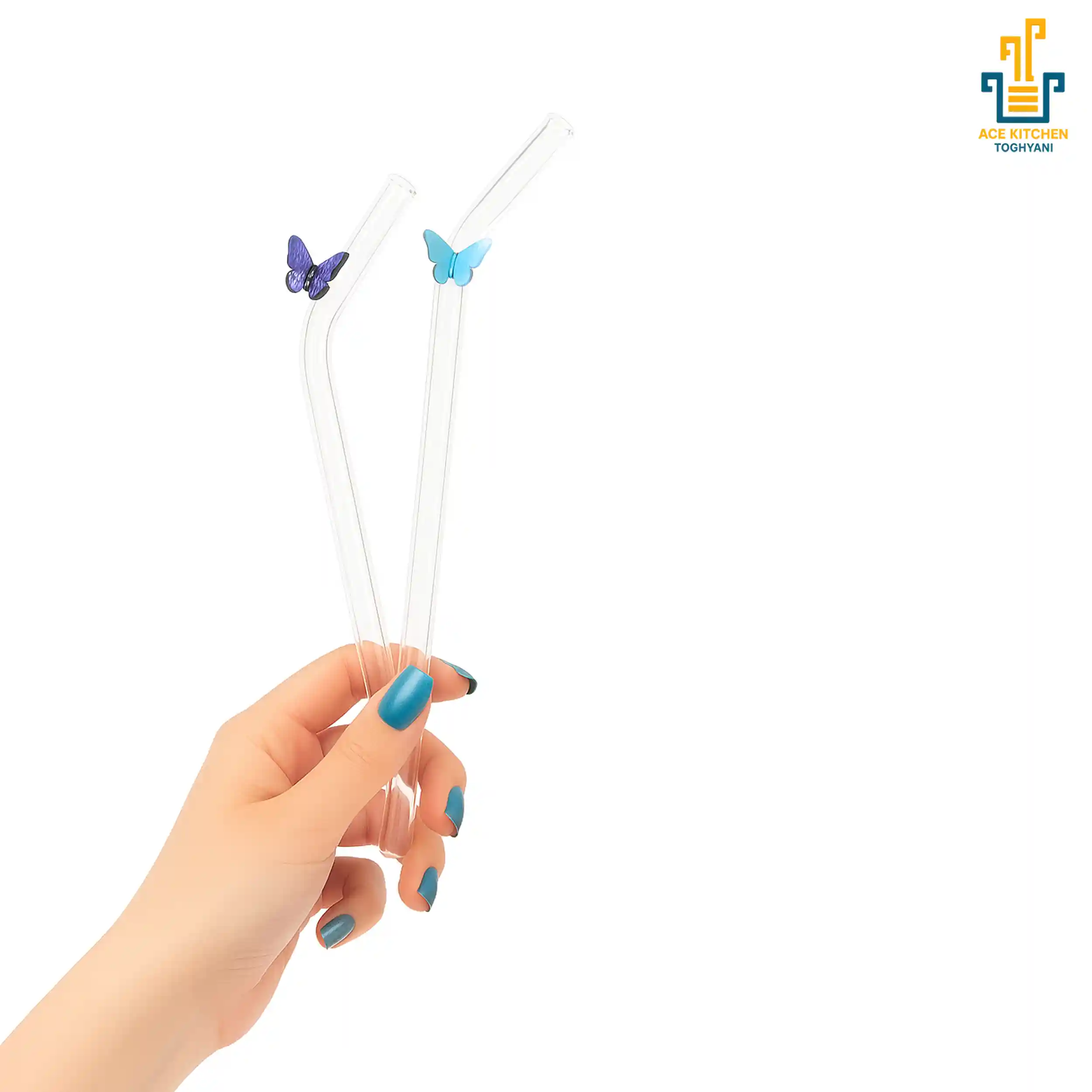 این ست نی ظریف و خاص از شیشه پیرکس شفاف و مقاوم ساخته شده؛ متریالی کاملاً بهداشتی که طعم و بوی نوشیدنی را تغییر نمیدهد و برای استفاده روزمره کاملاً ایمن است. فرم پروانهای در بالای نی، جلوهای لطیف، دخترانه و متفاوت به لیوان و میز پذیرایی میدهد.