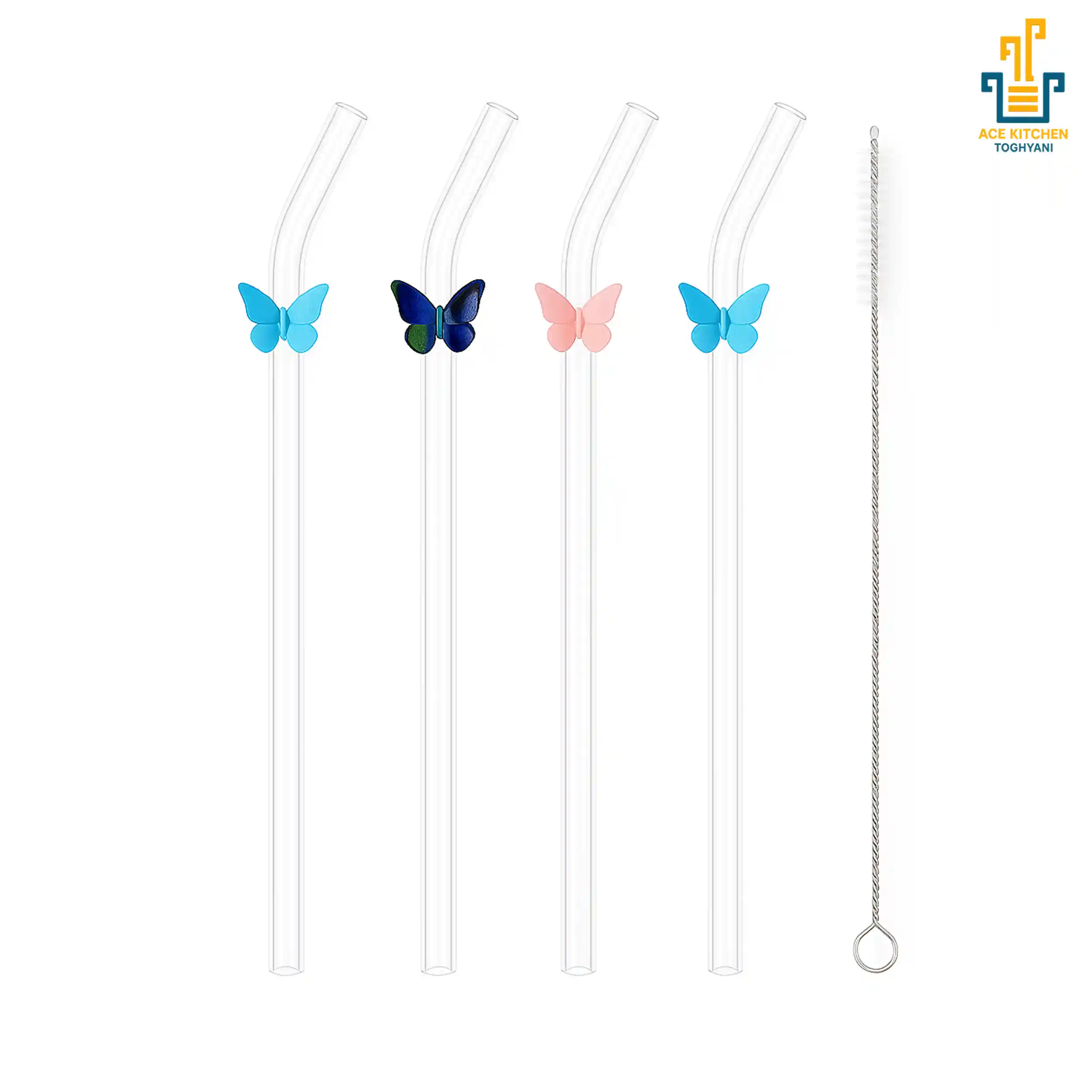 نی پیرکس پروانهای ست ۴ عددی با وزن محصول ۱۵ گرم و ابعاد محصول ارتفاع ۲۰ سانتیمتر، ساختهشده از شیشه پیرکس شفاف و مقاوم؛ مناسب نوشیدنیهای سرد و گرم با طراحی فانتزی، لطیف و قابل شستوشوی مکرر.